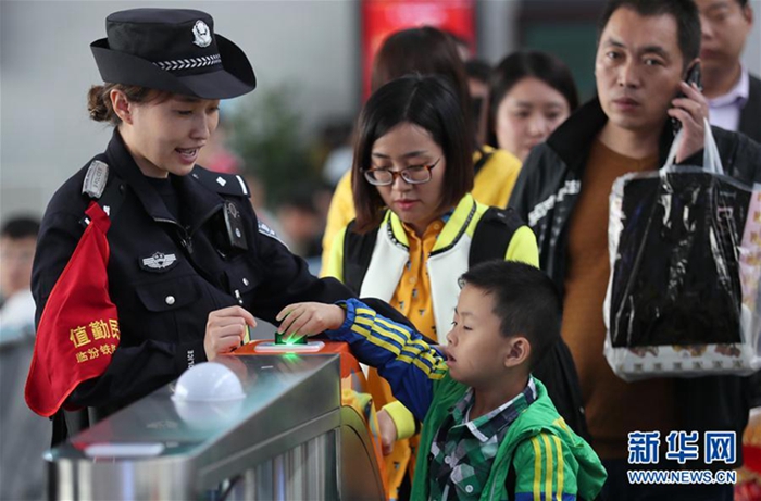 10月7日,在山西運城北站,1名小朋友在執勤民警的幫助下進站。隨著國慶、中秋假期接近尾聲,全國鐵路迎來返程客流高峰。新華社發(鮑東升 攝)