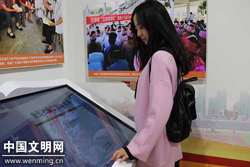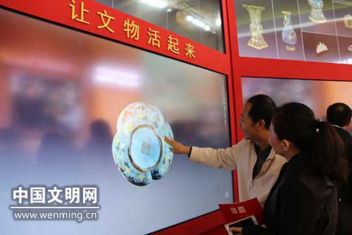 圖為觀眾在觸控屏幕上體驗文物360度全視角展示。中國文明網原茵攝