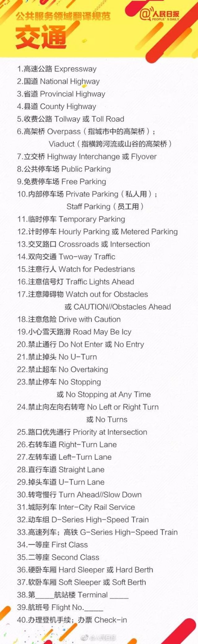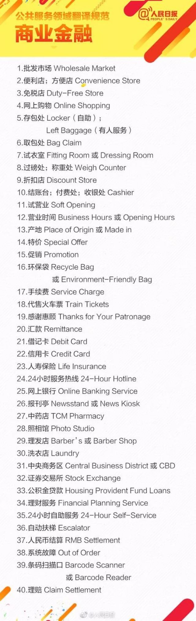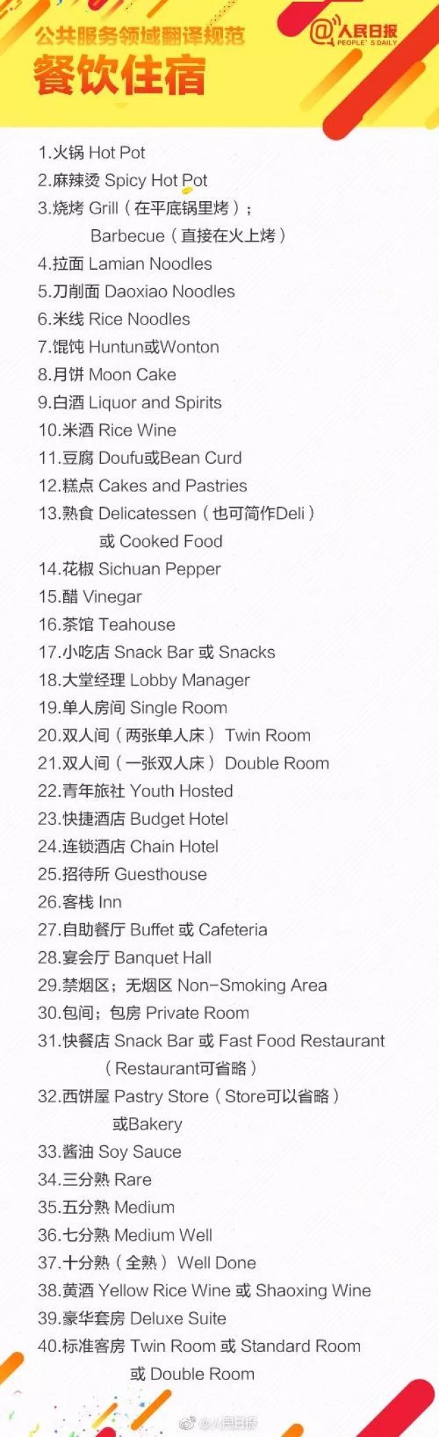 《標準》規定了交通、旅遊、文化、娛樂、體育、教育、醫療衛生、郵政、電信、餐飲、住宿、商業、金融共13個服務領域英文譯寫的原則、方法和要求,提供了常用的數千條規范譯文。其中麻辣燙、拉面、豆腐在公共場所的英文翻譯都有標準答案了。