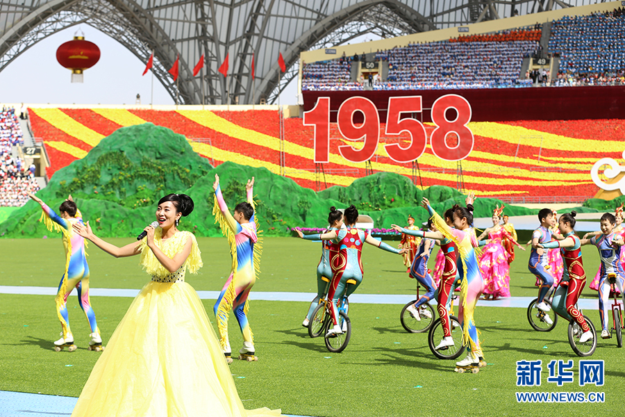 9月20日下午,寧夏回族自治區成立60周年慶祝大會將在賀蘭山體育場舉行。圖為暖場節目。新華網 張潔龍 攝