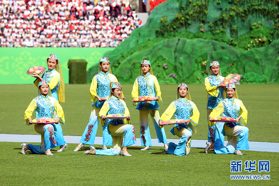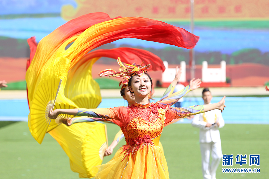 9月20日下午,寧夏回族自治區成立60周年慶祝大會將在賀蘭山體育場舉行。圖為暖場節目。新華網 張潔龍 攝
