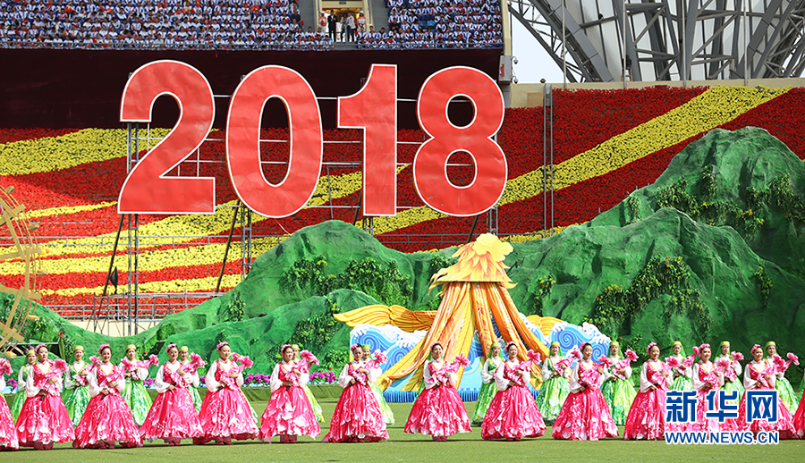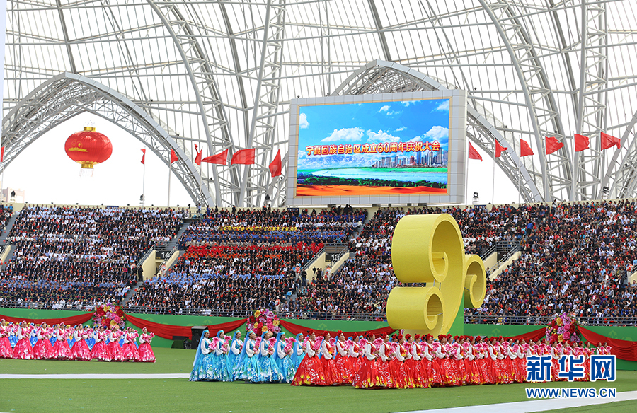 9月20日下午,寧夏回族自治區成立60周年慶祝大會在賀蘭山體育場舉行。圖為序曲《百花迎親人》。新華網 張潔龍 攝