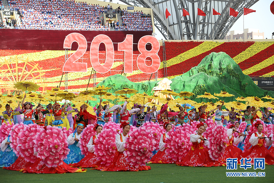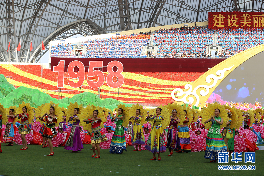 9月20日下午,寧夏回族自治區成立60周年慶祝大會在賀蘭山體育場舉行。圖為文藝演出《花兒朵朵向太陽》。新華網 張潔龍 攝