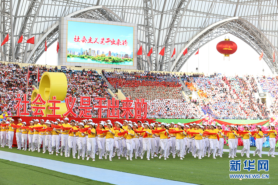 9月20日下午,寧夏回族自治區成立60周年慶祝大會在賀蘭山體育場舉行。圖為儀仗方隊上場。新華網 張潔龍 攝