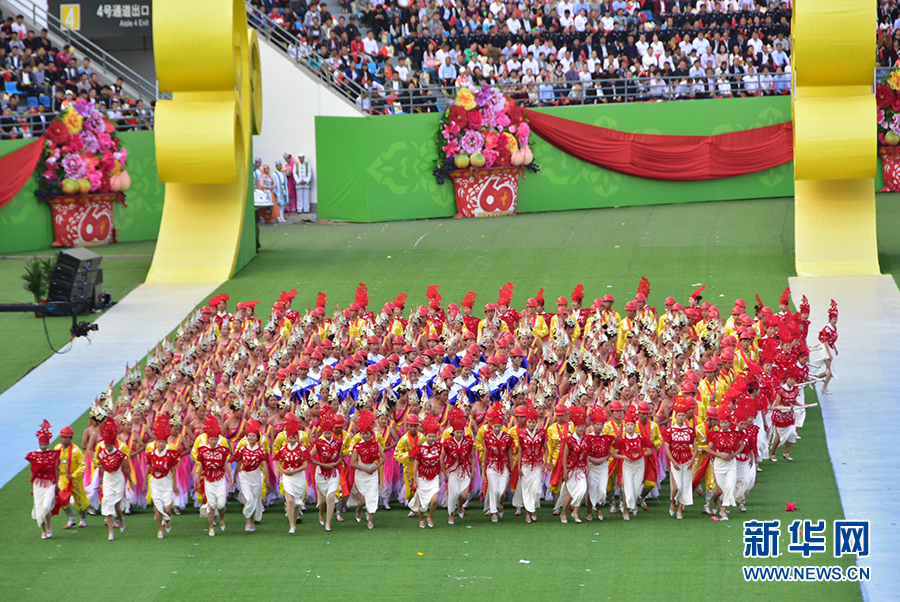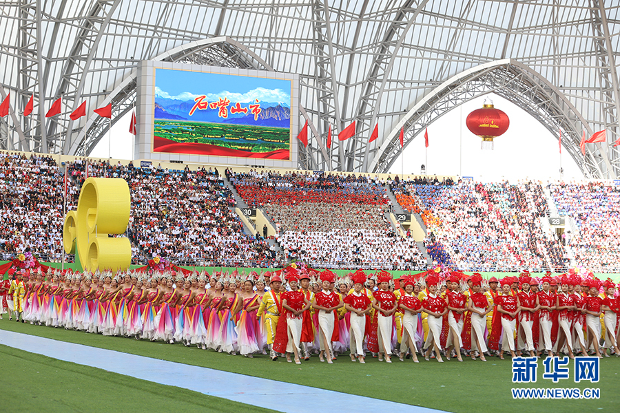 9月20日下午,寧夏回族自治區成立60周年慶祝大會在賀蘭山體育場舉行。圖為石嘴山市方隊上場。新華網 于晶 攝