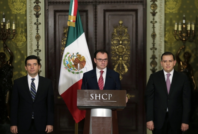 1月30日,墨西哥財政部長路易斯·比德加賴(中)在首都墨西哥城出席記者招待會。新華社/路透