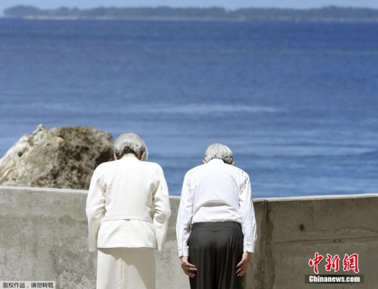 當地時間2015年4月9日,帕勞貝裏琉島,戰後70周年之際,日本明仁天皇夫婦向紀念碑獻花,紀念二戰陣亡者。