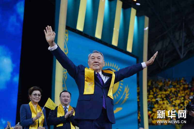 4月27日,哈薩克斯坦總統納扎爾巴耶夫參加在首都阿斯塔納的薩熱阿爾卡體育館舉行的選舉勝利慶祝大會。據哈薩克斯坦中央選舉委員會27日宣布的選票初步統計結果,現任總統納扎爾巴耶夫在26日舉行的總統選舉中以壓倒性優勢獲得勝利。新華社記者沙達提攝