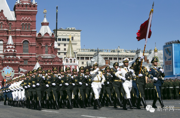 5月7日,俄羅斯在首都莫斯科的紅場舉行紀念衛國戰爭勝利70周年紅場閱兵式總彩排。圖為中國人民解放軍三軍儀仗隊在彩排中列隊行進。新華社記者 馬佔成攝