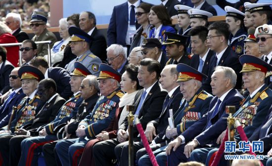 5月的莫斯科,草木蔥蘢,旌旗獵獵,古老的紅場莊嚴肅穆。習近平和夫人彭麗媛來到克裏姆林宮,同在那裏迎候的俄羅斯總統普京親切握手。隨後,習近平夫婦在普京總統陪同下,同出席慶典的其他貴賓步行前往紅場,登上檢閱臺就座,出席紅場閱兵儀式。中國、印度、獨聯體國家等的方隊也參加了閱兵。萬眾矚目中,由102人組成的中國人民解放軍儀仗隊通過紅場,這是中國首次派出儀仗方隊參加紅場閱兵,伴著《喀秋莎》樂曲,他們軍容嚴整,士氣高昂,步伐堅定有力,走出了軍威,彰顯了國威。習近平起身向他們揮手致意。