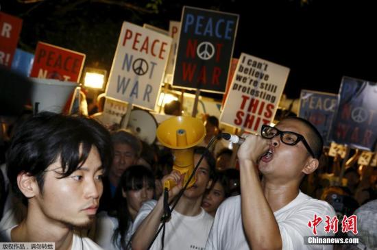 資料圖:7月16日,在日本東京國會附近,人們手舉標語參加抗議安保法案遊行活動。15日至16日,日本首相安倍晉三及執政聯盟強行推動國會眾議院通過安保法案,引發日本民眾強烈抗議。