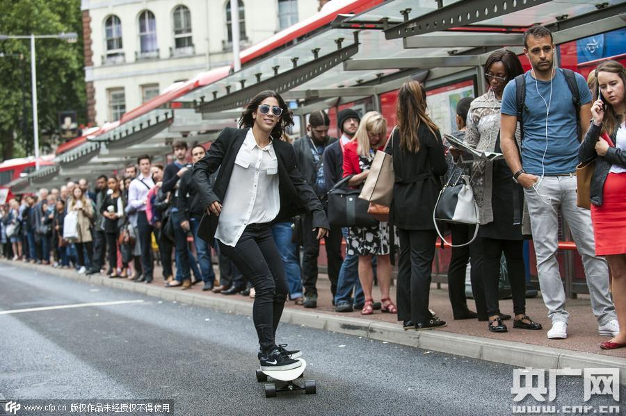 當地時間2015年8月6日,英國倫敦,英國地鐵職工大罷工持續進行,造成居民出行不便。21歲的Carla Calero踩滑板上班,“羨煞”路旁排隊等公交的人們。