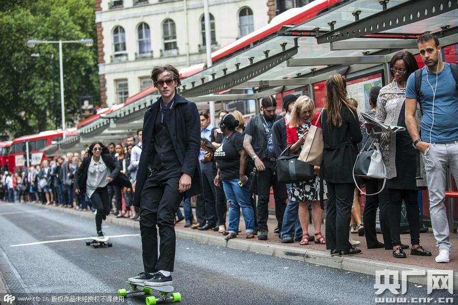 當地時間2015年8月6日,英國倫敦,英國地鐵職工大罷工持續進行,造成居民出行不便。22歲的Josh Ward-Brickett踩滑板上班,“羨煞”路旁排隊等公交的人們。