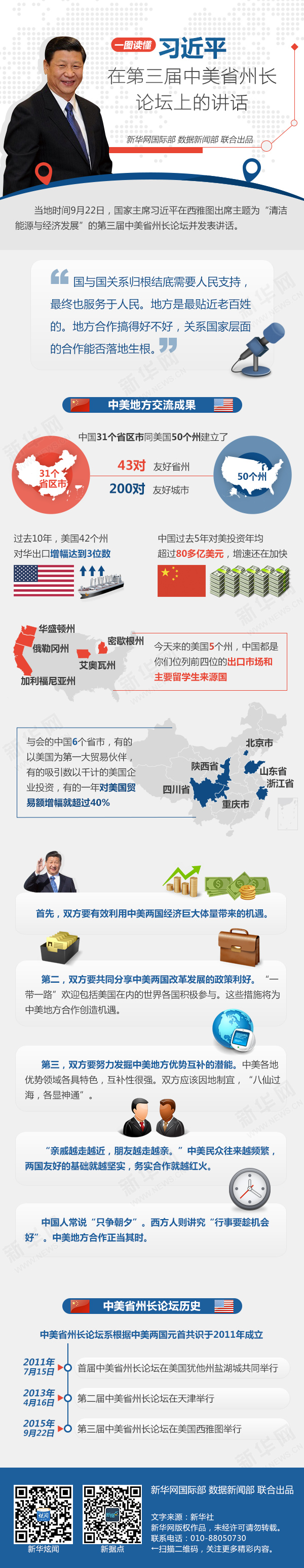 當地時間9月22日,國家主席習近平在西雅圖出席主題為“清潔能源與經濟發展”的第三屆中美省州長論壇並發表講話。