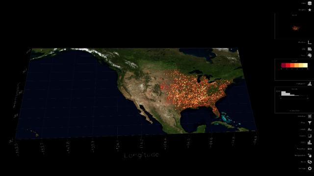 微軟在展示大數據可視化係統Surface Hub時,選定對美國過去40年間4萬多次龍卷風做了匯總,來顯示一段時間內某個地區的龍卷風的頻率。