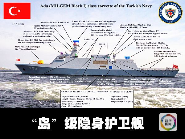 一旦發生衝突,土耳其的“島”級隱身護衛艦對俄羅斯活動在地中海的戰鬥艦只和補給艦只將構成巨大挑戰。“島”級隱身護衛艦由土耳其自行設計研制,除配備有“魚叉”二型反艦導彈外,還裝備意大利奧托-梅拉拉公司授權制造的76毫米隱身超級速射炮,每分鐘120發,射程16千米。“島”級隱身護衛艦具有高度隱身性能,可有效降低雷達、紅外線、聲波信號等,快速反應潛伏作戰能力強。