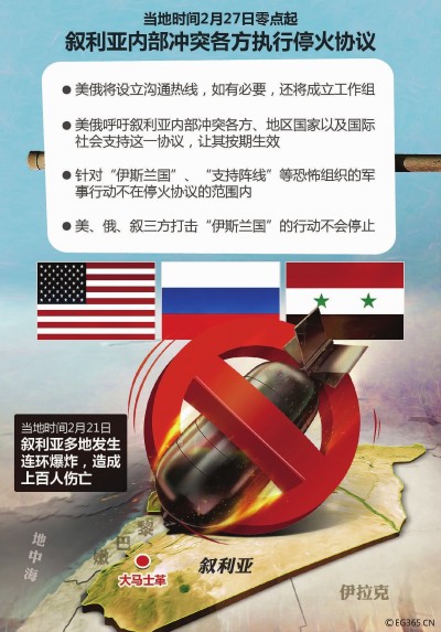 美國和俄羅斯官方22日均確認,雙方當日就敘利亞衝突各方停火達成協議,停火協議將從本月27日開始執行。聯合國秘書長潘基文通過發言人對此表示歡迎。