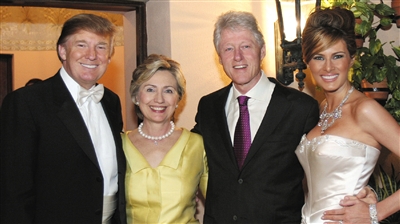 2005年,特朗普(左一)與第三任妻子梅拉尼婭(右一)結婚,克林頓和希拉裏出席婚禮並向他們表示祝賀。