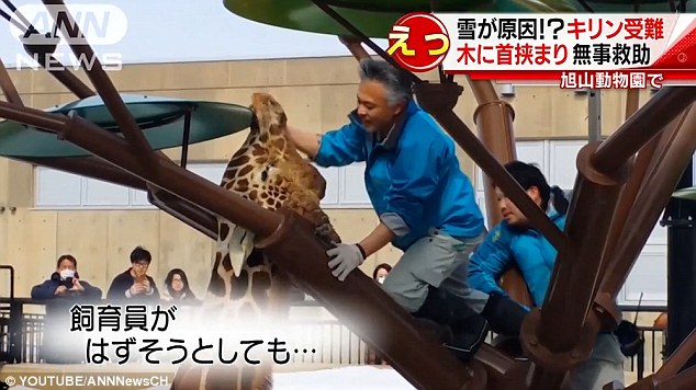 尷尬!日本一長頸鹿脖子被卡樹枝動彈不得(組圖)