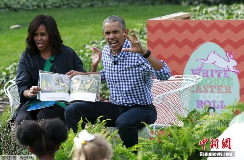 當地時間2016年3月28日,美國華盛頓,白宮舉行一年一度的復活節滾彩蛋活動。奧巴馬夫婦一起為小朋友們講故事,期間為了營造氣氛,夫妻倆在表情上做足功課。