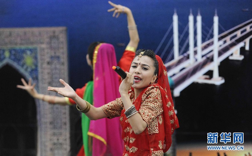 4月24日,在烏茲別克斯坦世界語言大學大禮堂,獲得特等獎的烏國立世界語言大學學生婉君在參加比賽。 新華網記者沙達提攝
