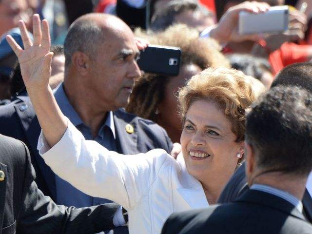 遭停職的巴西總統羅塞夫在總統府外向支持者致意。