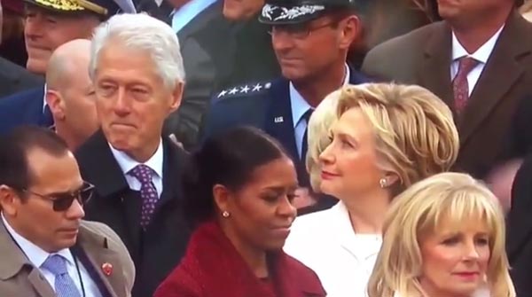 希拉裏突然發現她的丈夫並沒有看著講臺,心不在焉,順著他的視線看了一眼。然後希拉裏就長時間地盯著克林頓。