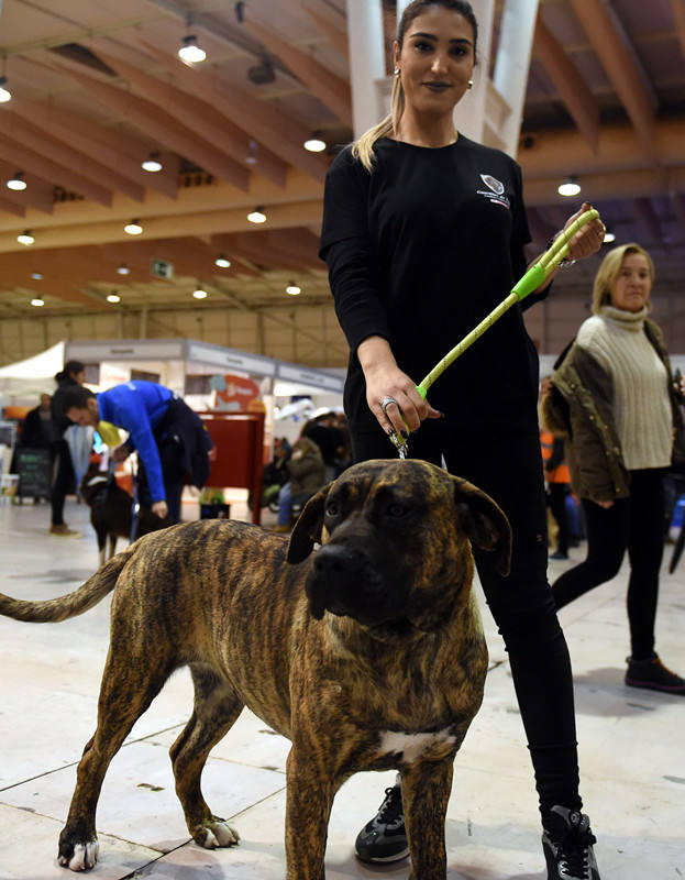 2017年2月5日,在葡萄牙裏斯本舉辦的寵物展上,一名女子攜寵物狗參展。(新華社記者張立雲攝)
