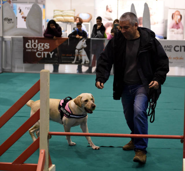 2017年2月5日,在葡萄牙裏斯本舉辦的寵物展上,一名男子攜寵物狗參展。(新華社記者張立雲攝)