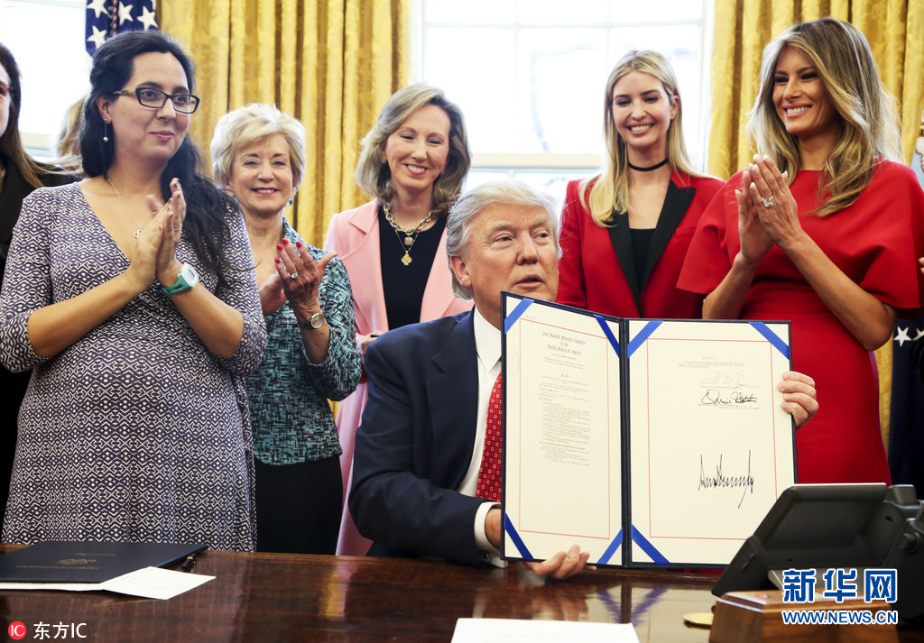 當地時間2017年2月28日,美國華盛頓,總統特朗普在白宮簽署HR321法案和HR255法案,指導NASA管理員鼓勵女學生學習和從事科學,技術,工程和數學事業,並鼓勵美國國家科學基金會以支持女性在STEM領域創業計劃,美國第一夫人梅拉尼婭和特朗普的女兒伊萬卡身穿紅衣現身,吸引眼球。圖片來源:東方IC