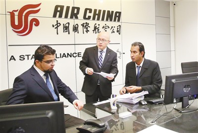 2016年12月28日,在巴基斯坦伊斯蘭堡,中國國際航空公司駐伊斯蘭堡營業部負責人(中)和巴方員工討論工作。2016年中巴經濟走廊建設取得積極進展。新華社發
