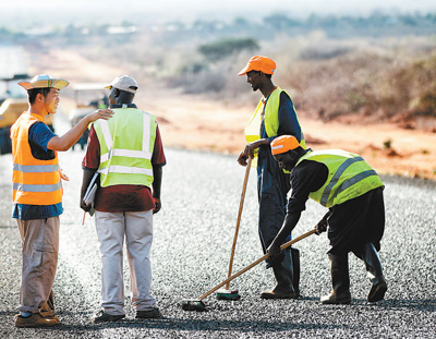 2016年3月5日,在肯尼亞馬薩比特郡,工程人員在托比—摩亞雷公路施工現場作業。中國在非洲的多個公路、鐵路項目在2016年或竣工通車或正在建設,這些項目有力推動了當地經濟發展,改善了當地人們的生活。新華社發