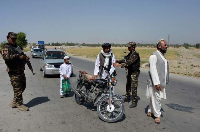 4月28日,在阿富汗賈拉拉巴德郊區的檢查點,安全人員檢查過往行人和車輛。 (新華社/法新)