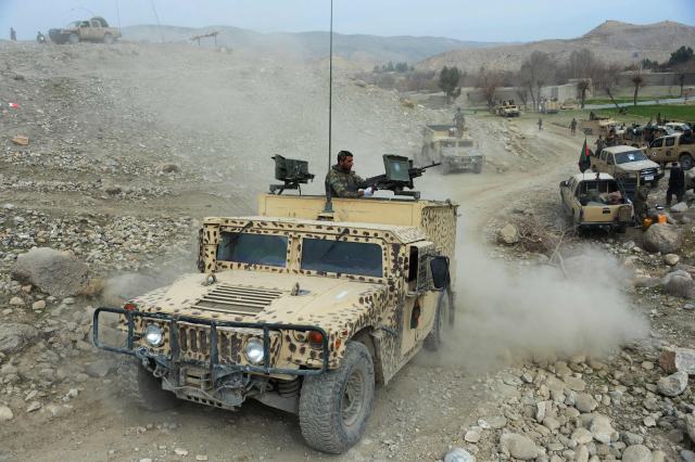 2月16日,在阿富汗楠格哈爾,阿安全部隊成員在與極端組織“伊斯蘭國”武裝分子的交戰中巡邏。 (新華社/法新)