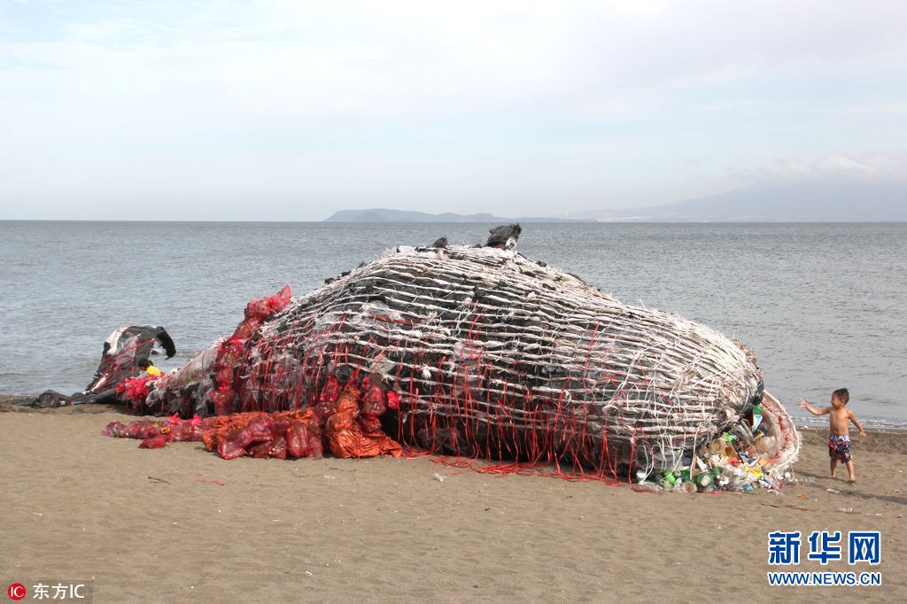 2017年5月19日報道(具體拍攝時間不詳),菲律賓綠色和平環保人士協同創意公司Dentsu Jayme Syfu打造了一尊塑料垃圾版巨型死鯨雕塑,呼吁人們關注海洋污染。這尊死鯨雕塑以藍鯨為原型,由從海上回收的塑料垃圾制造,長73英尺(約22.2米),高10英尺(約3米)。為了形象逼真,Dentsu Jayme Syfu公司專門邀請了當地的藝術家參與創作,使其獠牙、腹部紋理盡量接近真實藍鯨,巨大的死鯨雕塑的腹部主要由塑料袋、塑料容器和廢棄瓶子等填充制作。據悉,這尊死鯨雕塑的靈感來源于去年擱淺海灘的30具鯨魚屍體,其中一具發現自菲律賓達沃的薩馬爾島。(圖片來源: 東方IC)