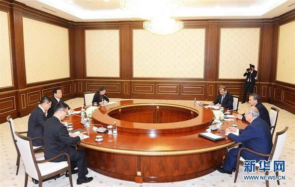 5月18日,在烏茲別克斯坦首都塔什幹,全國人大常委會副委員長兼秘書長王晨(前左)會見烏茲別克斯坦最高會議立法院主席伊斯莫伊洛夫。新華社記者沙達提攝