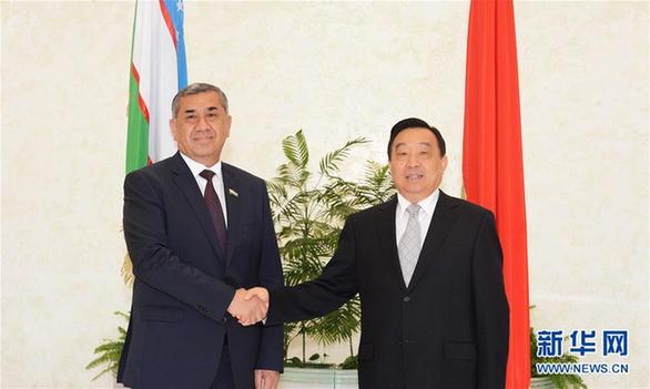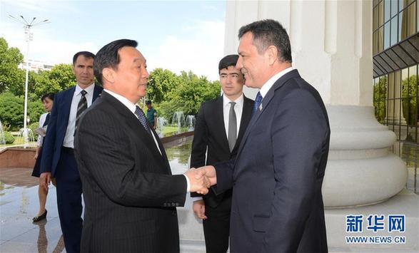 5月19日,在烏茲別克斯坦首都塔什幹,全國人大常委會副委員長兼秘書長王晨(右)會見烏茲別克斯坦最高會議參議院主席尤爾達舍夫。新華社記者沙達提攝