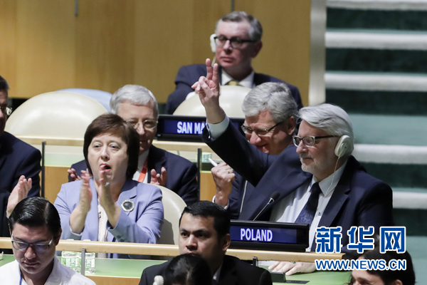6月2日,在位于紐約的聯合國總部,波蘭外長瓦什奇科夫斯基在波蘭當選2018年和2019年安理會非常任理事國後致意。新華社記者李木子攝