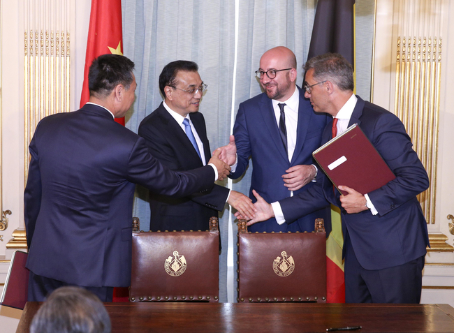 雙手緊緊相握,快門咔咔作響。在克強總理和比利時首相米歇爾的共同見證下,他們簽署了基礎設施、工業、質檢、電信、物流、港口等領域多份雙邊合作文件。