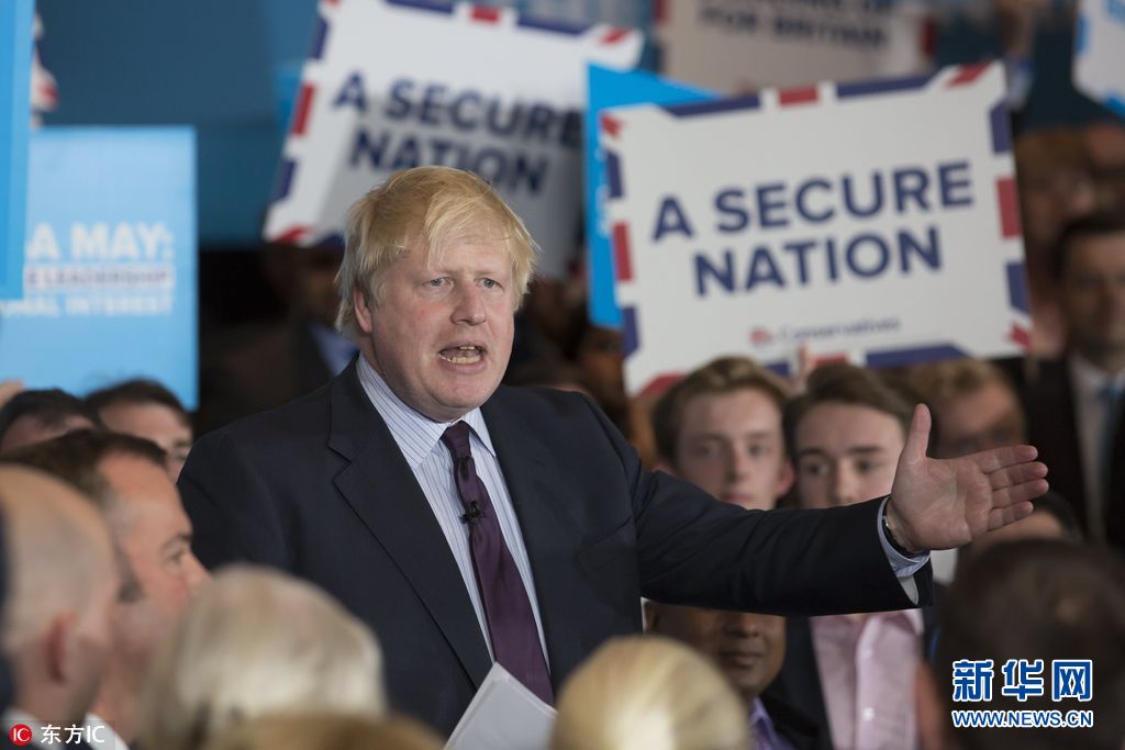 當地時間2017年6月7日,英國伯明翰,英國大選前一天,英國首相、保守黨領袖特雷莎·梅為競選積極造勢,向支持者發表講話。圖為英國外長鮑裏斯。(圖片來源:東方IC)