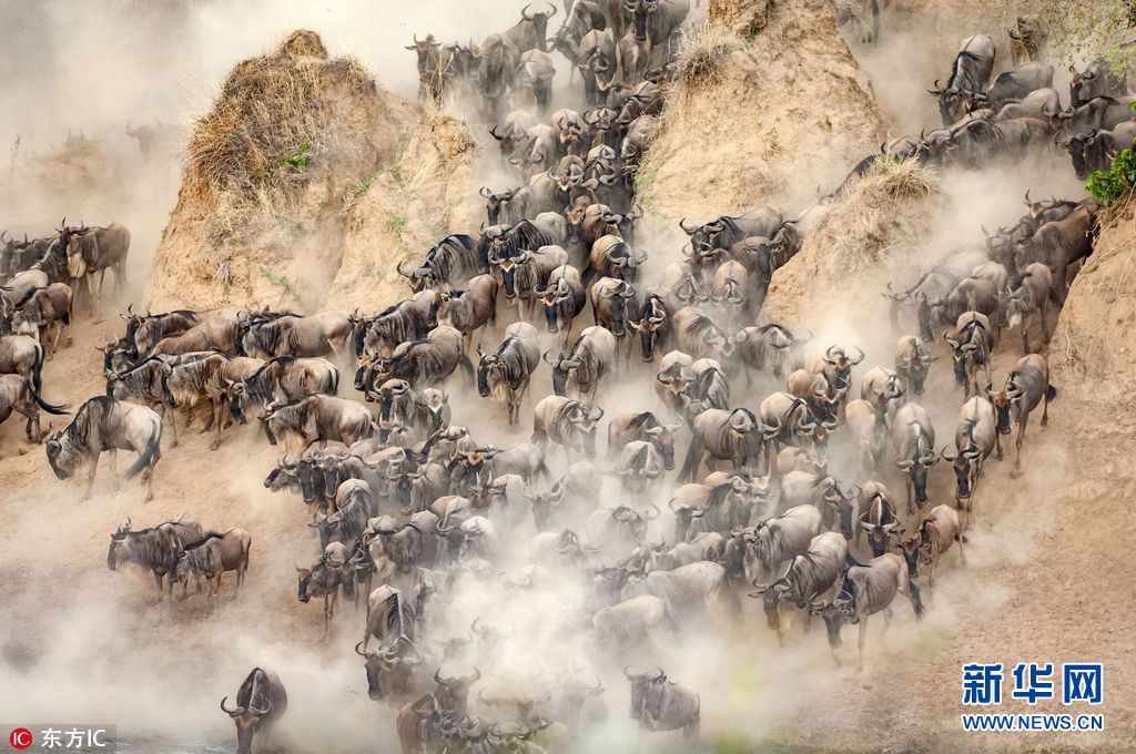 2017年6月13日報道(具體拍攝時間不詳),角馬遷徙中!這些震撼的照片拍攝于肯尼亞馬賽馬拉國家公園的Serena過境點(Serena Crossing Point)附近。畫面中成千上萬的角馬覆蓋大地,它們冒著險阻跋涉在非洲大地上,揚起滾滾塵土。此外,它們還要冒著生命的危險穿越埋伏著捕食者的河水。來自德國的攝影師Ingo Gerlach拍攝下了這些角馬大規模遷徙的畫面。(圖片來源: 東方IC)