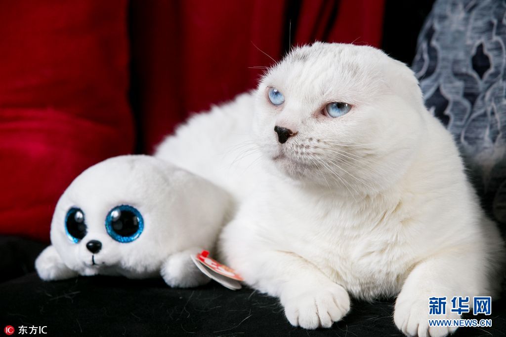 2017年7月3日報道(具體拍攝時間不詳),美國馬裏蘭州,白色貓咪天生眼睛藍色且沒有耳朵,撞臉自己最喜歡的玩具海豹。這只貓咪名叫Otitis,長得很特別,沒有雙耳,它的主人是23歲的莫利(Molly Lichtenwalner)。