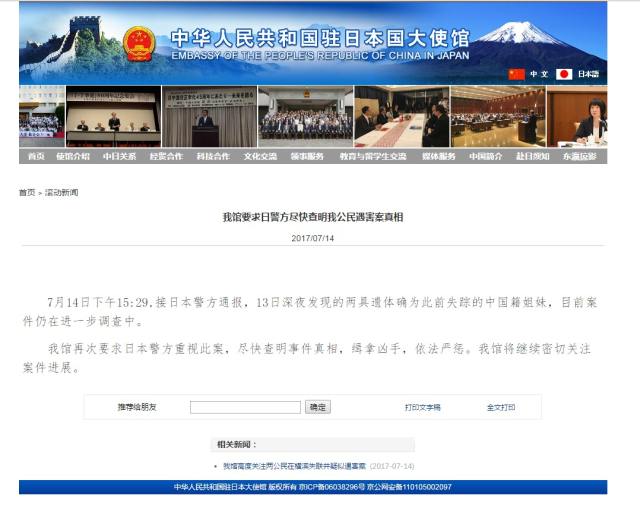 7月14日,中國駐日本大使館發布公告,確認接到日本警方通報,13日深夜發現的兩具遺體確為此前失蹤的中國籍姐妹。(圖片來源:中國駐日本大使館官方網站)