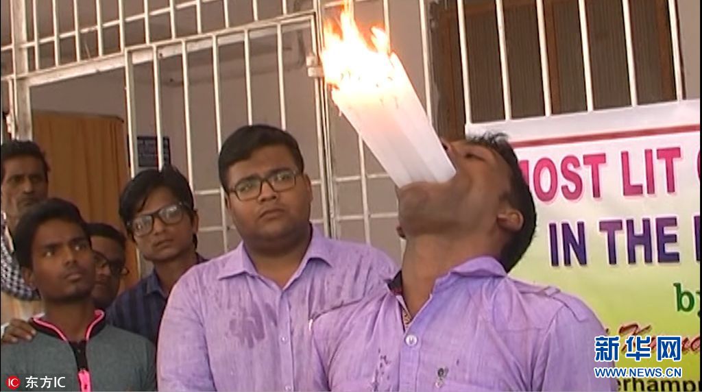 2017年5月24日報道(具體拍攝時間不詳),近日,23歲的印度青年Manoj Kumar Moharana一天內創造了兩項世界紀錄。首先,這位來自印度的小夥往嘴裏塞上了21支點著的蠟燭,打破了由另一名孟買人Dinesh Shivnath Upadhyaya所創造的吉尼斯世界記錄,Upadhyaya曾于2017年1月創造了往嘴裏塞入18支蠟燭的世界紀錄。同一天,Moharana又打破了往嘴裏放入最多無核葡萄的世界記錄。(圖片來源: 東方IC)