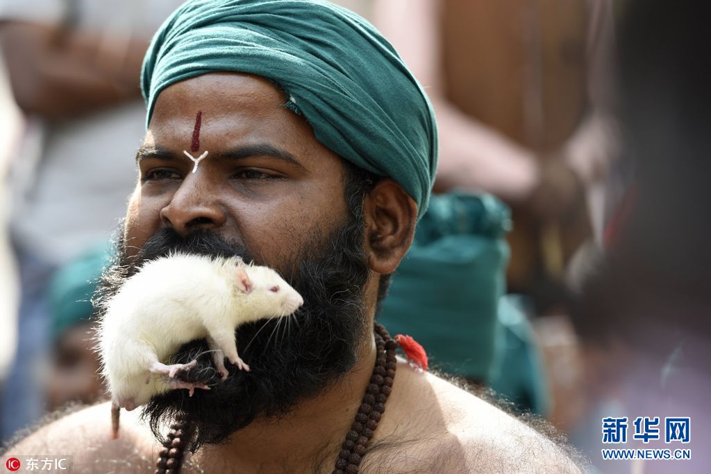 當地時間2017年3月27日,印度新德裏,來自印度南部泰米爾納德邦的農民把活老鼠放進嘴裏,揚言如果聯邦政府再不提供抗旱救災包,他們就只能吃老鼠果腹了。(圖片來源: 東方IC)