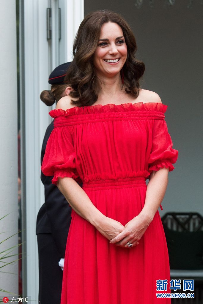 當地時間2017年7月19日,德國柏林,英國威廉王子夫婦出訪德國,出席花園派對,凱特王妃身穿紅色露肩長裙亮相,明艷動人吸睛。(圖片來源: 東方IC)