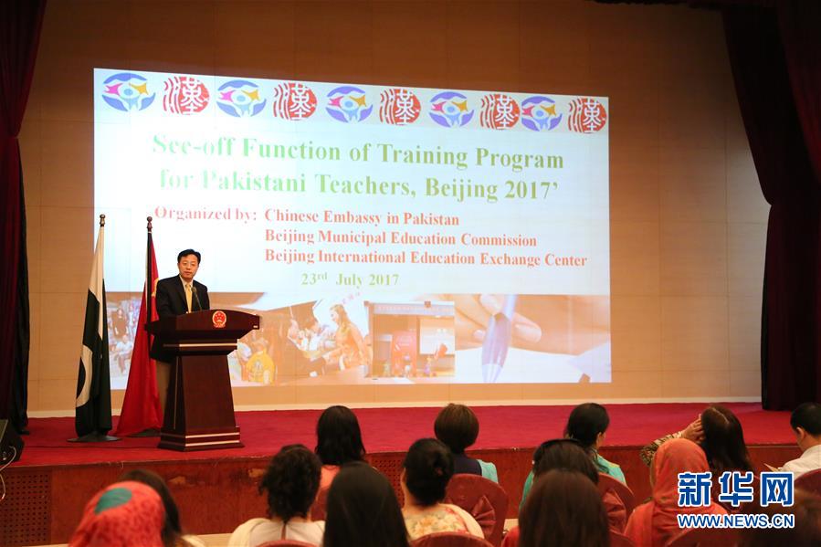 7月23日,在巴基斯坦首都伊斯蘭堡,中國駐巴基斯坦大使館臨時代辦趙立堅在巴基斯坦教師赴華培訓送行活動上致辭。新華社發(艾哈邁德·卡邁勒攝)