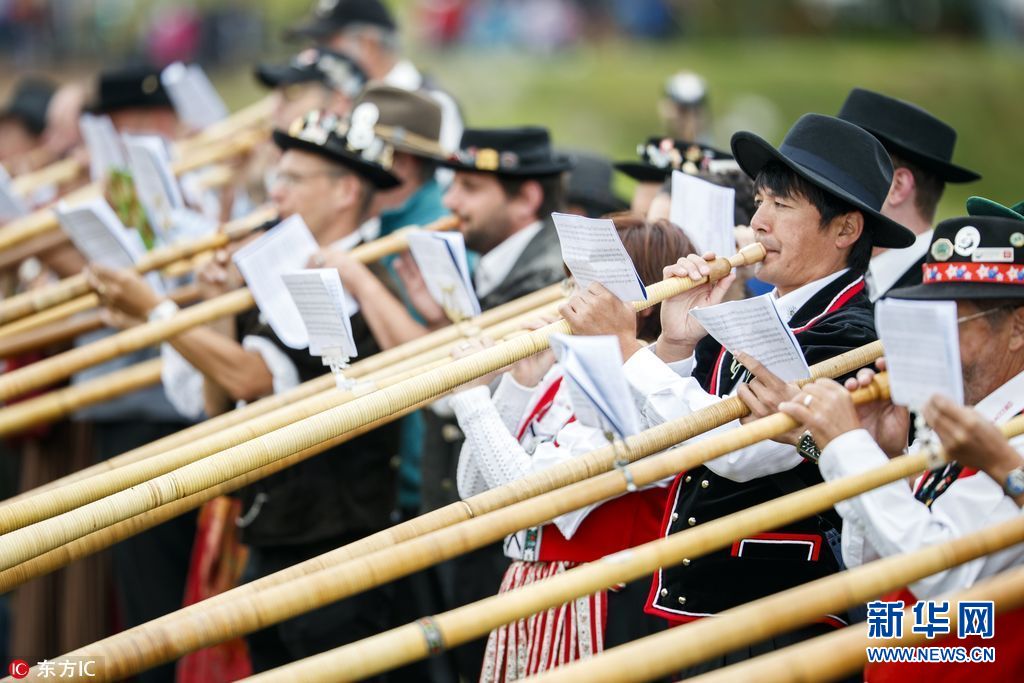 當地時間2017年7月23日,瑞士嫩達茲,瑞士高山舉辦傳統阿爾卑斯號角音樂節。阿爾卑斯號角又被稱作山笛,是當地的一種傳統管樂器。據悉,超過180名吹號角者現身音樂節,節日將持續3天。(圖片來源: 東方IC)