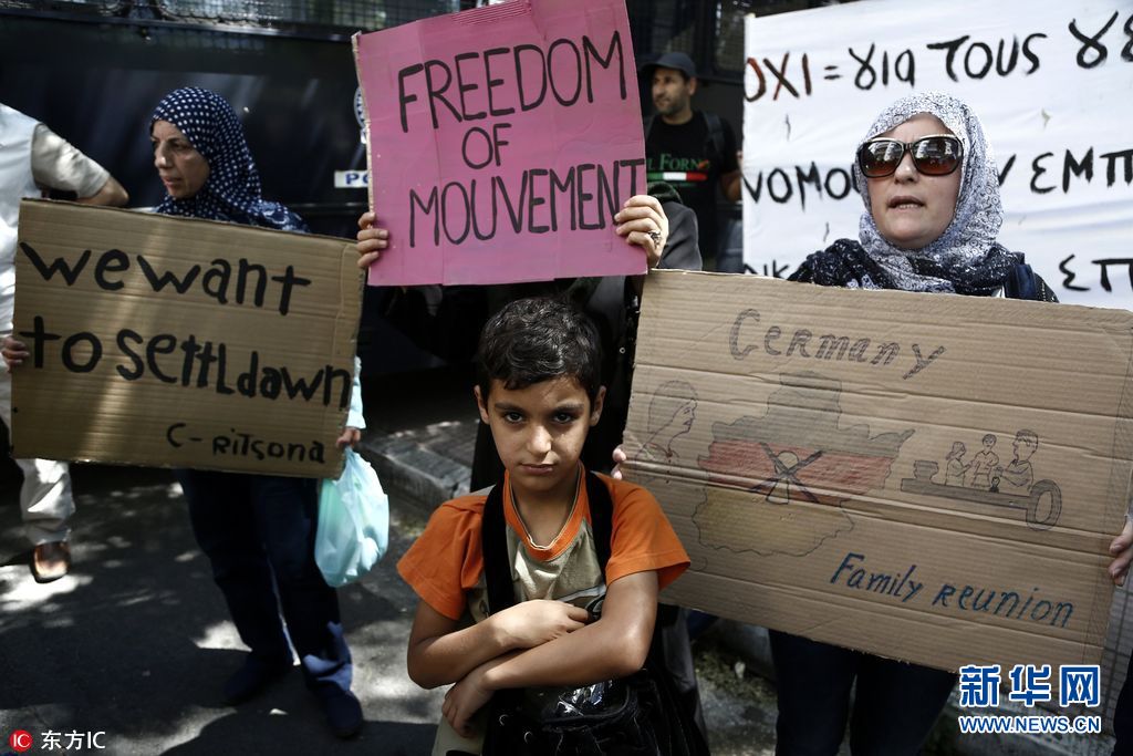 當地時間2017年8月2日,希臘雅典,滯留在希臘的移民和難民在德國大使館外抗議,與防爆警察發生衝突。據悉,約150名主要來自敘利亞的難、移民在德國駐希臘使館外,抗議德國限制難民帶家屬在德團聚。(圖片來源: 東方IC)