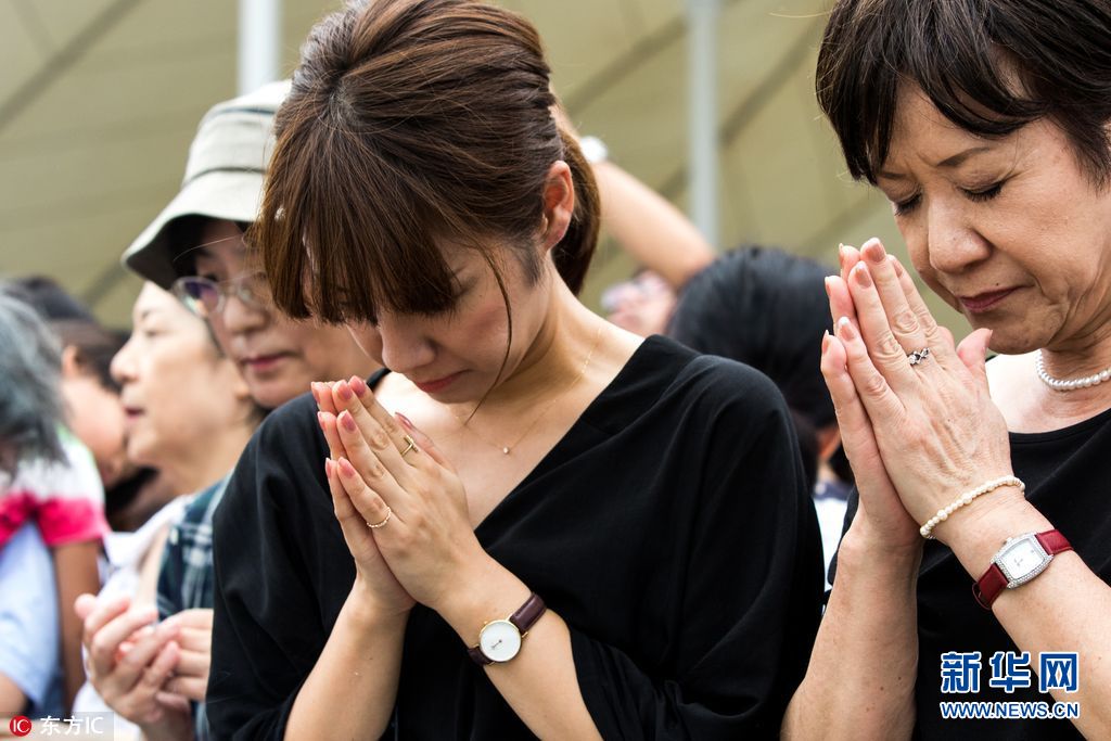 當地時間2017年8月9日,日本長崎,日本紀念長崎原子彈事件72周年,民眾在長崎和平公園默哀悼念死難者,首相安倍晉三向遇難者紀念碑敬獻花圈。1945年8月9日,美軍出動B-29轟炸機將代號為“胖子”的原子彈投到日本長崎市。長崎市約60%的建築物被毀,傷亡8.6萬人,約佔全市總人口的37%。(圖片來源: 東方IC)